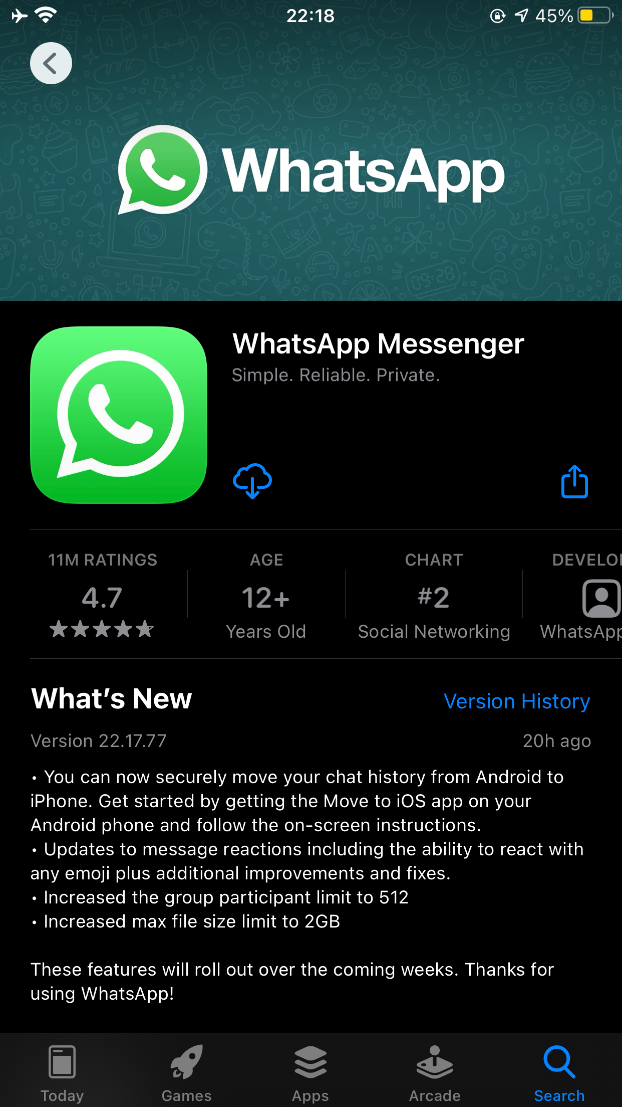 After a long time, WhatsApp has finally issued a new update on the App Store available to all users on iOS 12 and subsequent versions. WhatsApp notes the option to migrate your chat history from Android to iOS for the first time in the official changelog for the 22.17.77 stable update: